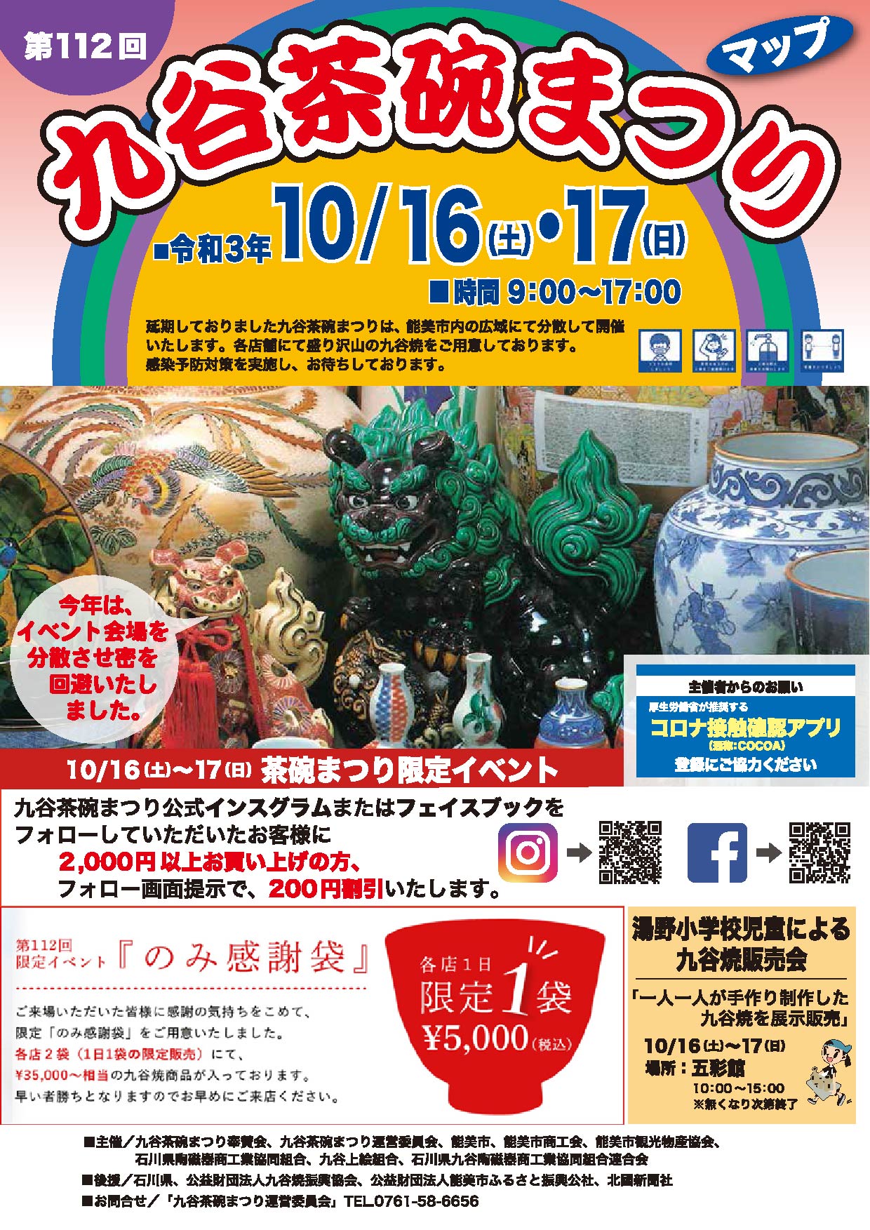 令和3年9月1日に開催されました九谷茶碗まつり奉賛会にて、延期しておりました「第112回九谷茶碗まつり」を、新型コロナウイルス感染防止対策を徹底した上、開催することが決定いたしました。